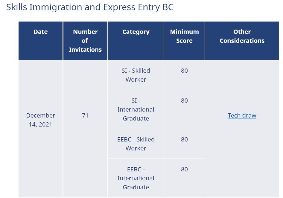 相隔半個月,BC省於 12 月 14 日通過 BC PNP Tech 邀請了 71 名從事科技工作的技術工人和國際留學生遞交省提名申請,本次抽籤的最低分數為80分,比上次抽籤略高2分。截至現在,BC省今年已發出近12,000份省提名的邀請。這些申請人在省提名獲批後,即可遞交永久居留簽證申請或者遞交快速通道申請,從而獲得永久居民身份。